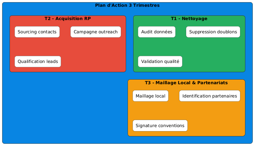 - T3 : maillage local renforcé, citations via événements sectoriels, partenariats association