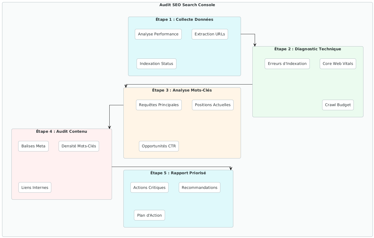 La puissance d’un diagnostic SEO ne vient pas d’un outil unique, mais de la mise en relation de données issues de sources différentes. Voici la séquence que j’utilise pour des audits couvrant des sites de taille intermédiaire.