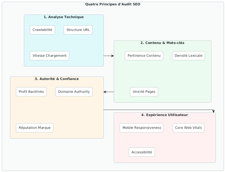 Un audit SEO est une évaluation multicouche : elle examine l’infrastructure technique, la qualité du contenu, le profil de liens et l’expérience utilisateur — quatre dimensions qui interagissent. Traiter l’une sans tenir compte des autres, c’est optimiser une roue pendant que les trois autres sont à plat.