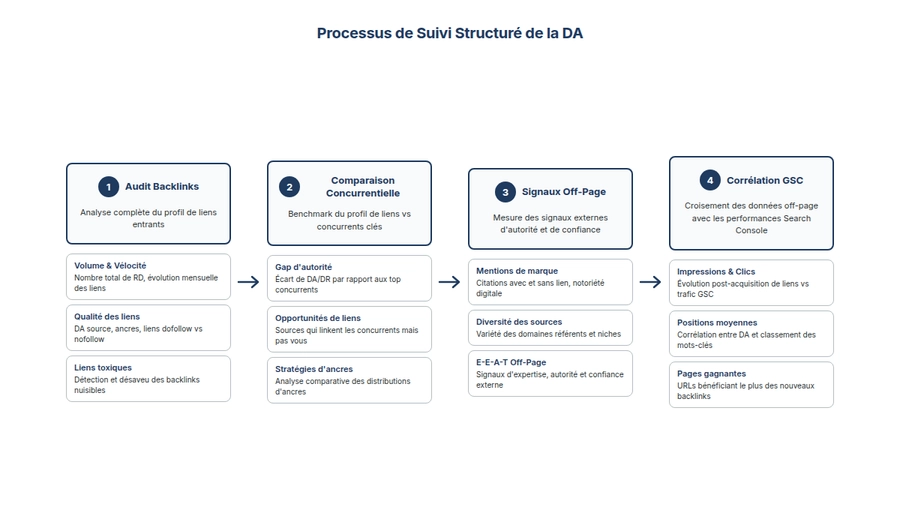 • Corrélation DA / positions / trafic via Google Search Console : c’est la seule façon de distinguer une progression réelle d’un artefact métrique.