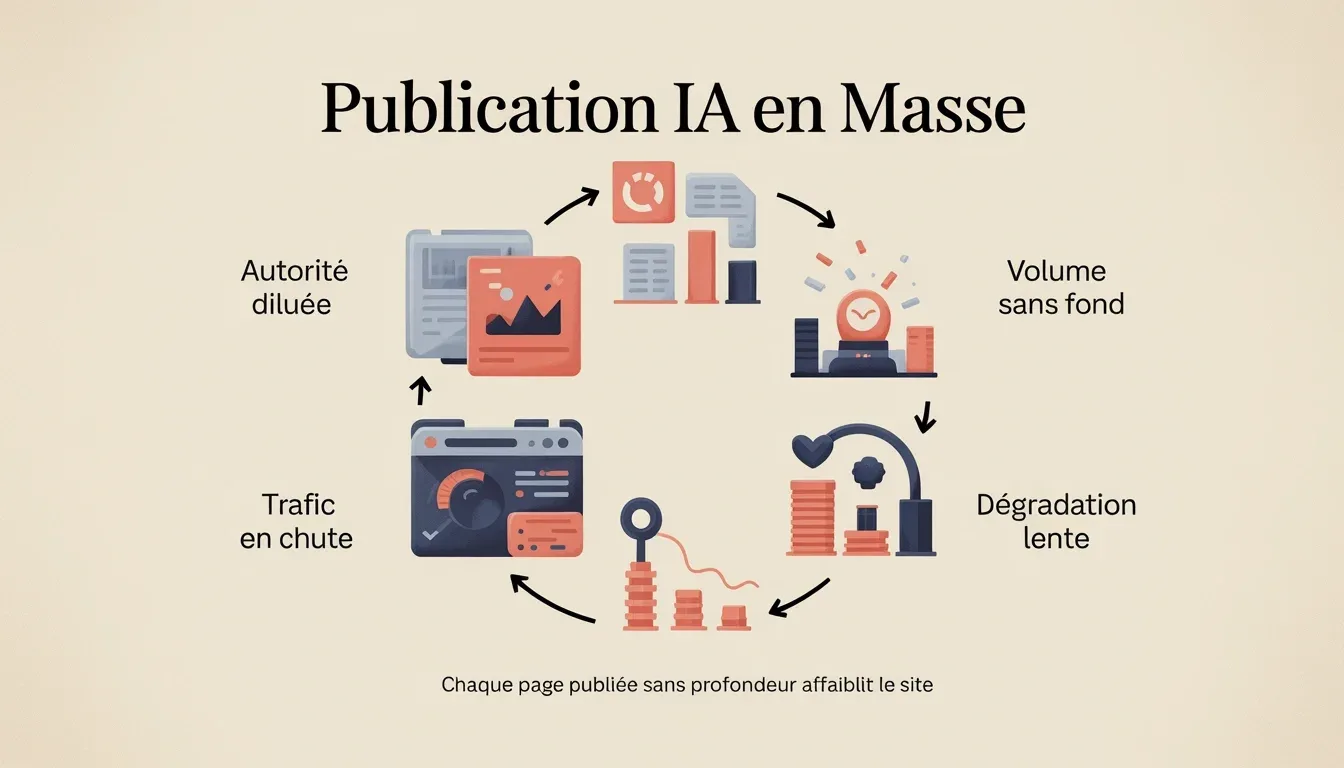 Depuis 2022, les mises à jour algorithmiques ciblent précisément les schémas de contenu produit en masse : formulations génériques, structures répétitives, absence d’ancrage réel. Le site qui multiplie les pages sans profondeur ne gagne pas en autorité — il dilue ce qu’il avait. J’ai vu des domaines perdre 30 à 40 % de leur trafic organique après des campagnes de publication IA non supervisées. Pas une pénalité manuelle. Une dégradation algorithmique progressive, difficile à inverser.