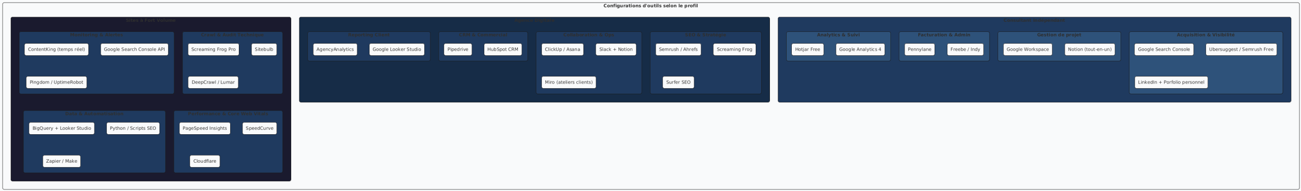 - Consultant indépendant / petits sites : Screaming Frog + Search Console + PageSpeed Insights