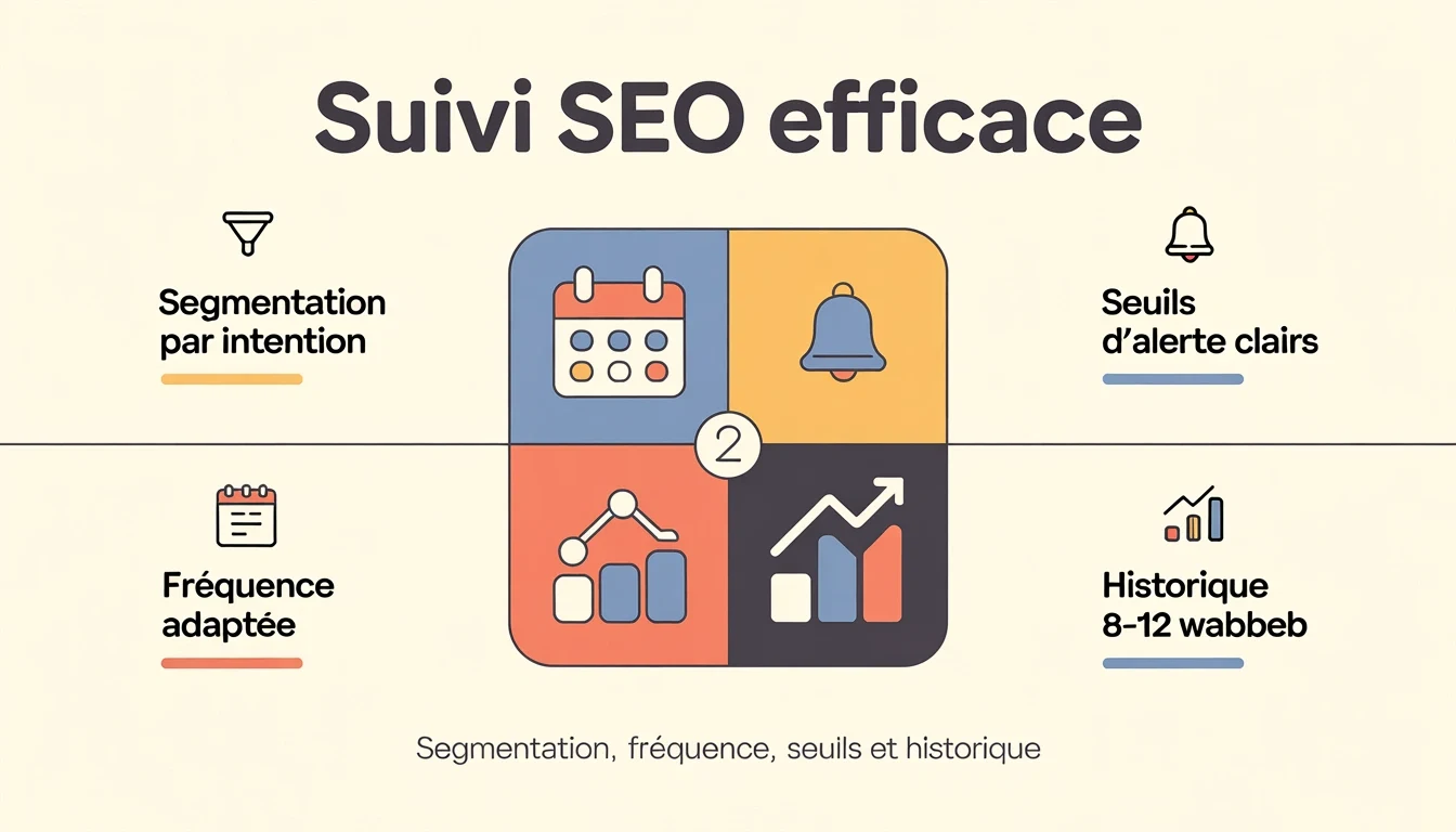 Configure un suivi segmenté, choisis une fréquence adaptée à ta réalité, et fixe des seuils d’alerte qui correspondent à tes vrais leviers. Regarde toujours la SERP avant de conclure à une sanction. Et méfie-toi des moyennes : elles lissent exactement ce que tu aurais besoin de voir.