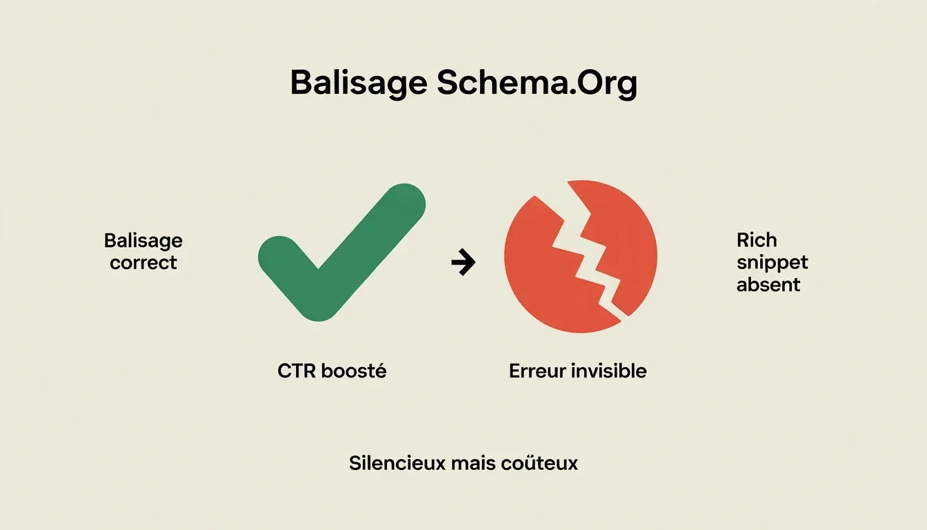 Du coup, le risque est doublement pernicieux : tu ne le vois pas, et tu ne le ressens pas immédiatement. Sur certaines requêtes, un balisage correct peut générer entre 12 et 35% de taux de clic supplémentaire. Un champ manquant, une propriété mal placée, et ce gain est réduit à zéro — sans que personne ne le remarque pendant des semaines.